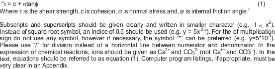Mathematical symbols and formulae should be typed. Equation numbers should appear in parentheses at the right-hand side of the equations and be numbered consecutively. For Greek or other non-Roman letters, identify the symbol in words in the left-hand margin just below the equation the first time it is used. In addition, the meaning of symbols used in equations should be given below the equations.